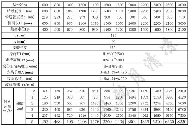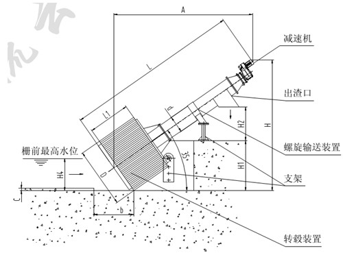 設(shè)備與水平面呈35°安裝在水渠中,污水從鼓的端頭流入鼓中,水通過柵網(wǎng)的柵縫流出,格柵將漂浮物和沉積物截留,隨著截流量的怎多,過濾面積越來越小,水頭損失逐漸增大,當(dāng)轉(zhuǎn)轂內(nèi)外水位差達(dá)到設(shè)定值時(shí),除污耙自動(dòng)回轉(zhuǎn)梳除柵渣,卸入鼓內(nèi)德集渣斗內(nèi),由內(nèi)置的螺旋輸送機(jī)提升,柵渣一邊上行一邊瀝水,至頂端壓榨及擠壓脫水,卸入貯渣容器中,外運(yùn)處理。