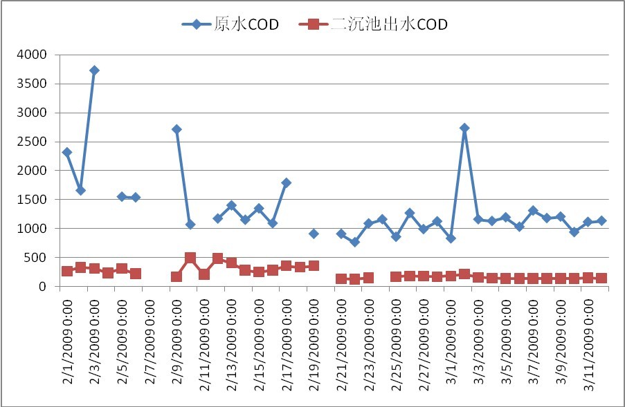 • 在連續(xù)沖擊階段COD去除效果與歷史相近狀況相對照,在原水COD總量增加約16%的情況下,二沉池出水COD降低約20%。