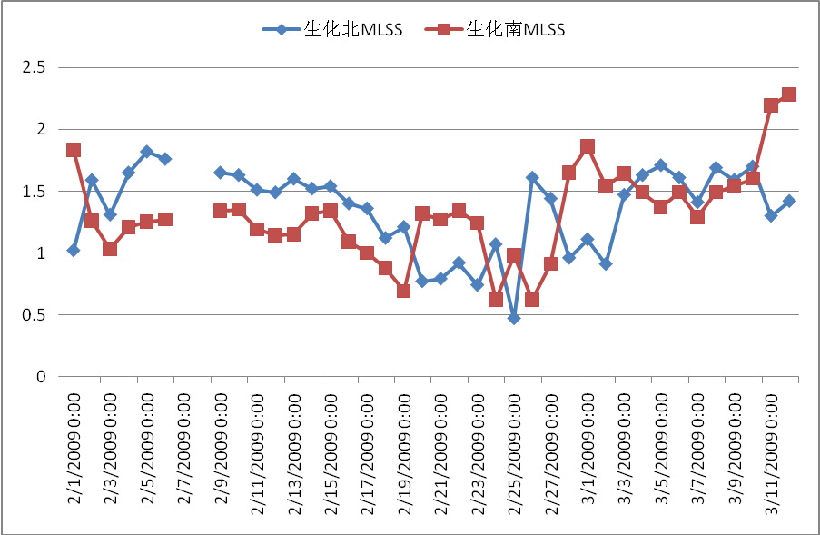 污泥濃度分析,在系統(tǒng)連續(xù)沖擊時間,污泥濃度生化南、北的平均值分別為2.21mg/l和1.92mg/L,與生物增效前和生物增效前期相對照數(shù)據(jù)如下表: