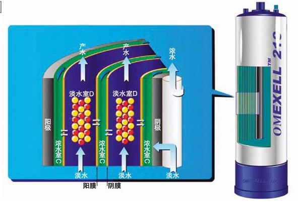濃水從元件底部進(jìn)入位于元件中心的“C室”(濃水室),在直流電場(chǎng)的作用下,一部分水分子(H2O)分解成氫離子(H+)和氫氧根離子(OH-)。這些H+和OH-持續(xù)地再生填充于淡水室的離子交換樹脂。帶正電荷的陽(yáng)離子和帶負(fù)電荷的陰離子分別被吸附到相應(yīng)的樹脂上,并且受電場(chǎng)陽(yáng)極和陰極的作用,通過(guò)相應(yīng)的樹脂遷移,穿過(guò)陽(yáng)、陰膜進(jìn)入濃水室而被出去。陰膜僅允許陰離子通過(guò),而陽(yáng)離子和液體無(wú)法通過(guò);陽(yáng)膜僅允許陰離子通過(guò),而陰離子和液體無(wú)法通過(guò)。