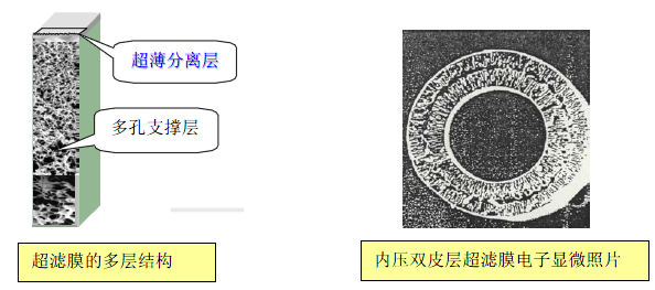 超濾膜屬于非對(duì)稱(chēng)的結(jié)構(gòu),即包括致密的皮層(真正起分離作用)和多孔的支撐層。這種結(jié)構(gòu)既保證了良好的分離效果,又提高了膜通量,降低運(yùn)行能耗,并抗污堵。這些因素使得膜產(chǎn)品最終能夠?qū)崿F(xiàn)大工業(yè)化的應(yīng)用。目前在青島、山西等地多個(gè)熱電廠(chǎng)的鍋爐給水系統(tǒng)中已經(jīng)成功采用超濾做為反滲透的預(yù)處理。