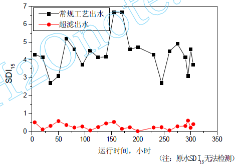 3. 試驗(yàn)期間超濾產(chǎn)水的SDI15 在0.5以下,遠(yuǎn)遠(yuǎn)優(yōu)于常規(guī)工藝。