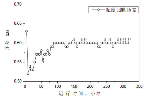 試驗(yàn)期間在保持超濾產(chǎn)水量恒定的情況下,記錄了超濾進(jìn)出水的壓差變化。如上圖所示,超濾投入運(yùn)行后,在前80小時(shí),膜兩側(cè)的壓差總體趨勢(shì)逐步上升,在隨后的200多小時(shí)時(shí)間里,壓差則趨于穩(wěn)定。這一過(guò)程是水中的雜質(zhì)在新的超濾膜表面積累并形成 “凝膠層”的過(guò)程。一旦凝膠層建立,膜通量的下降就趨于平緩,并逐步達(dá)到穩(wěn)態(tài)。圖中的曲線(xiàn)恰當(dāng)?shù)胤从沉诉@一過(guò)程。表明在試驗(yàn)期間膜的污堵情況十分輕微。