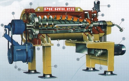 | 1.主電機 2.液力耦合器(或其他驅(qū)動方式) 3.轉(zhuǎn)股 4.開放式螺旋 5.可調(diào)溢流堰壩板 6.ROTOVARIATOR® 差轉(zhuǎn)速自動調(diào)節(jié)裝置 7.行星齒輪減速器 8.刮板裝置電機 9.沉積物刮板間 10.往復(fù)式可調(diào)進料器 11.支架 12.固相出口 13.溢流液相出口 14.減震系統(tǒng) 15.清潔孔 16.差轉(zhuǎn)速傳感器 |