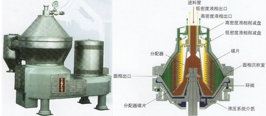 當(dāng)液體到達(dá)離心力最大的分離區(qū)域時(shí),液體的流向?qū)l(fā)生改變而流向轉(zhuǎn)鼓的中央,并在那里在一個(gè)固定的削減盤產(chǎn)生的壓力作用下排出。在通過(guò)碟片時(shí),固體顆粒向碟片下側(cè)運(yùn)動(dòng),然后朝轉(zhuǎn)鼓內(nèi)壁運(yùn)動(dòng),并積聚在固相沉積室。