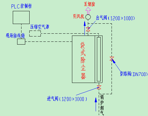 整個除塵系統(tǒng)包括三部分:①袋式除塵器系統(tǒng);②旁路;③控制系統(tǒng);