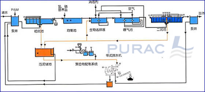 由自動格柵去除較大顆粒懸浮物的廢水,由進(jìn)水泵井送至初沉池通過添加PAM可更好的去除污泥和纖維,出水重力流入均衡池,經(jīng)過均衡調(diào)節(jié)的廢水由污水泵提升進(jìn)入選擇器+曝氣池的生物處理部分去除有機(jī)物。曝氣池出水重力流入二沉池,泥水分離后排放。初沉池和二沉池的污泥一并由帶式脫水機(jī)脫水處理后外運(yùn)處置。