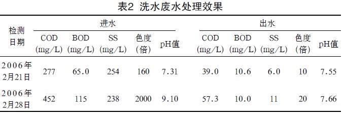 該工程調(diào)試期間氣溫較低,經(jīng)過有關(guān)調(diào)試人員2個多月的努力,廢水處理系統(tǒng)運行結(jié)果良好,對COD、BOD、色度、SS的去除率均在80%以上,處理出水水質(zhì)達(dá)到廣東省地方標(biāo)準(zhǔn)《水污染物排放限值》(DB44/26-2001)一級標(biāo)準(zhǔn)(見表2)。