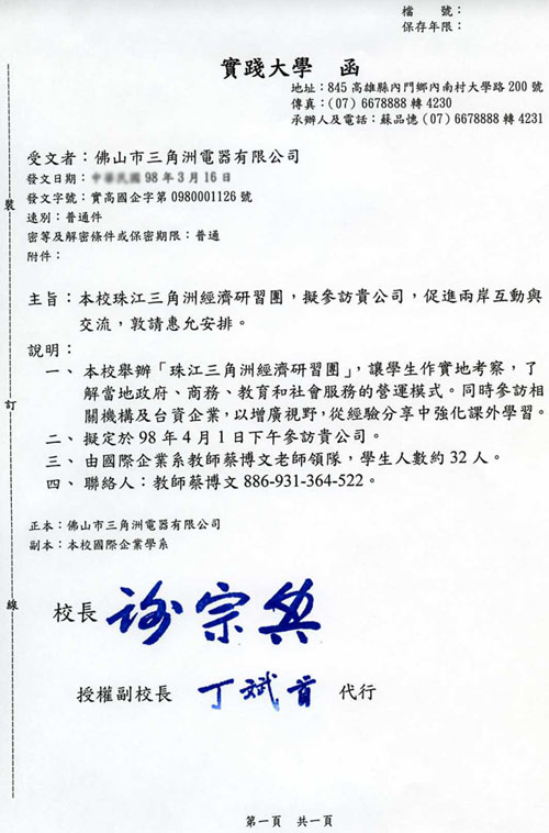 來源:佛山市三角洲電器科技有限公司 閱讀:1845 更新時間:2009-03-20 17:47臺灣實踐大學(xué)國際企業(yè)學(xué)系“珠江三角洲經(jīng)濟(jì)研究團(tuán)”師生32人將來佛山市三角洲電器科技有限公司參訪。