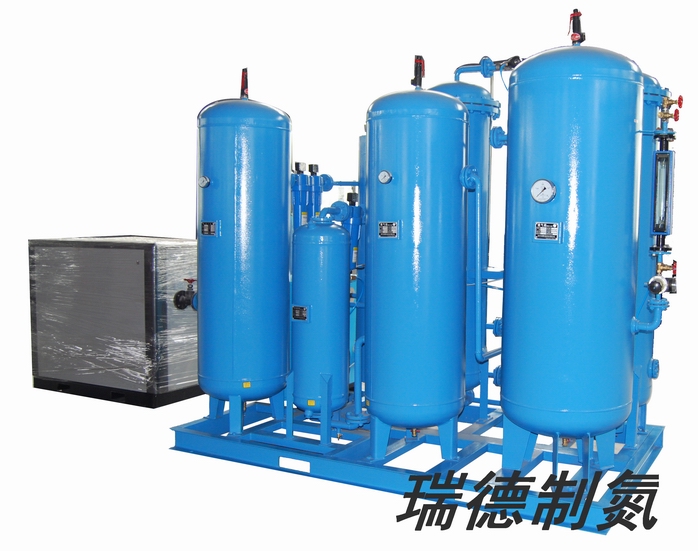 RDN系列制氮機是根據(jù)變壓吸附原理,采用高品質的碳分子篩作為吸附劑,在一定的力學效應,氧在碳分子篩微孔中擴散速率遠大于氮,在吸附未達到平衡時,氮在氣相中被富集起來,形成成品氮氣。然后減壓至常壓,吸附劑脫附所吸附的氧氣等其它雜質,實現(xiàn)再生。一般在系統(tǒng)中設置兩個吸附塔,一塔吸附產(chǎn)氮,另一塔脫附再生,通過PLC程序自動控制,使兩塔交替循環(huán)工作,以實現(xiàn)連續(xù)生產(chǎn)高品質氮氣之目的。壓力下,經(jīng)過凈化干燥的壓縮空氣,在吸附器中進行加壓吸附、減壓脫附。