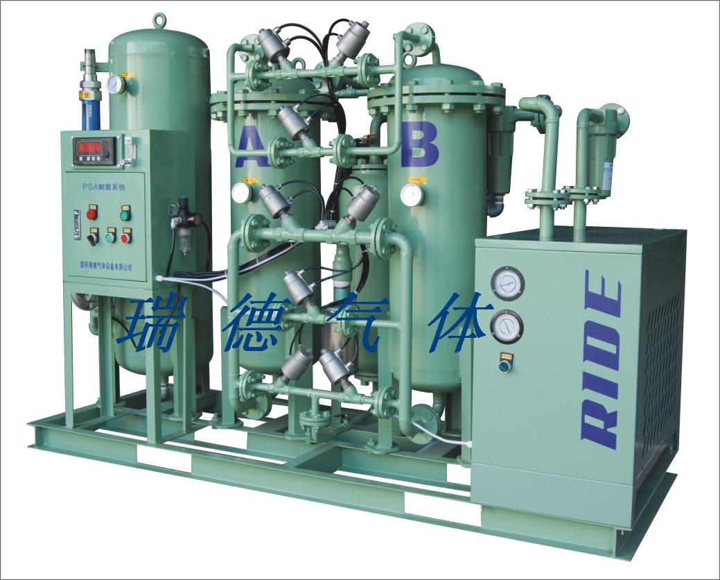 RDN系列制氮機是根據(jù)變壓吸附原理,采用高品質的碳分子篩作為吸附劑,在一定的力學效應,氧在碳分子篩微孔中擴散速率遠大于氮,在吸附未達到平衡時,氮在氣相中被富集起來,形成成品氮氣。然后減壓至常壓,吸附劑脫附所吸附的氧氣等其它雜質,實現(xiàn)再生。一般在系統(tǒng)中設置兩個吸附塔,一塔吸附產氮,另一塔脫附再生,通過PLC程序自動控制,使兩塔交替循環(huán)工作,以實現(xiàn)連續(xù)生產高品質氮氣之目的。壓力下,經過凈化干燥的壓縮空氣,在吸附器中進行加壓吸附、減壓脫附。
