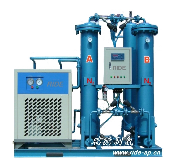 RDN系列制氮機是根據(jù)變壓吸附原理,采用高品質(zhì)的碳分子篩作為吸附劑,在一定的力學效應,氧在碳分子篩微孔中擴散速率遠大于氮,在吸附未達到平衡時,氮在氣相中被富集起來,形成成品氮氣。然后減壓至常壓,吸附劑脫附所吸附的氧氣等其它雜質(zhì),實現(xiàn)再生。一般在系統(tǒng)中設置兩個吸附塔,一塔吸附產(chǎn)氮,另一塔脫附再生,通過PLC程序自動控制,使兩塔交替循環(huán)工作,以實現(xiàn)連續(xù)生產(chǎn)高品質(zhì)氮氣之目的。壓力下,經(jīng)過凈化干燥的壓縮空氣,在吸附器中進行加壓吸附、減壓脫附。