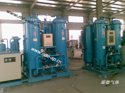 RDN系列制氮機是根據(jù)變壓吸附原理,采用高品質(zhì)的碳分子篩作為吸附劑,在一定的力學(xué)效應(yīng),氧在碳分子篩微孔中擴散速率遠大于氮,在吸附未達到平衡時,氮在氣相中被富集起來,形成成品氮氣。然后減壓至常壓,吸附劑脫附所吸附的氧氣等其它雜質(zhì),實現(xiàn)再生。一般在系統(tǒng)中設(shè)置兩個吸附塔,一塔吸附產(chǎn)氮,另一塔脫附再生,通過PLC程序自動控制,使兩塔交替循環(huán)工作,以實現(xiàn)連續(xù)生產(chǎn)高品質(zhì)氮氣之目的。壓力下,經(jīng)過凈化干燥的壓縮空氣,在吸附器中進行加壓吸附、減壓脫附。