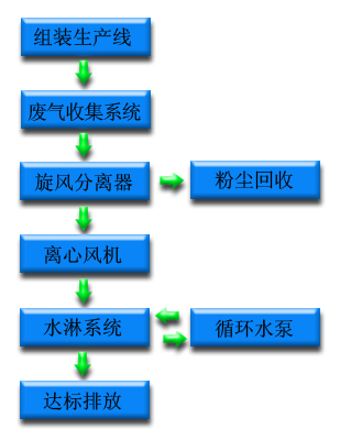 組裝生產(chǎn)線產(chǎn)生的含鉛粉塵性氣體在離心風(fēng)機(jī)產(chǎn)生的負(fù)壓作用下自吸入主風(fēng)管,再在負(fù)壓作用下沿切線方向進(jìn)入旋風(fēng)分離器,廢氣中的顆粒物質(zhì)在慣性作用力的作用下沿器壁下滑到底部錐形集粉斗中,由人工回收重新利用,凈化后的氣體由頂部導(dǎo)入離心風(fēng)機(jī)輸入到水淋系統(tǒng)。