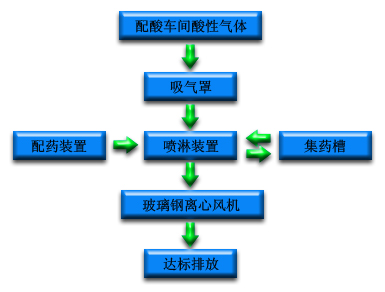 該廠采用的酸為硫酸,因硫酸有其吸水性,故該系統(tǒng)產(chǎn)生的酸氣只在于其配制過程中及其冷卻過程中因硫酸稀釋產(chǎn)生的巨大熱量而導(dǎo)致的產(chǎn)生的酸霧現(xiàn)象,周時該廠采用的配酸桶采用更換交替使用的方式工作,故該系統(tǒng)采用兩套吸風(fēng)系統(tǒng)進(jìn)行單獨吸氣,每個吸氣罩服務(wù)5個配酸桶。配酸時產(chǎn)生的酸霧在離心風(fēng)機(jī)產(chǎn)生的負(fù)壓作用下由吸氣罩進(jìn)入主風(fēng)管,主風(fēng)管的風(fēng)速控制在15m/s以下,以保證高速氣體的流動不會對管道產(chǎn)生振動和產(chǎn)生噪聲。酸性氣體由主風(fēng)管進(jìn)入噴淋裝置(滌氣塔),滌氣塔內(nèi)裝有球形填料,由循環(huán)泵對塔底堿液進(jìn)行提升后由噴淋系統(tǒng)霧化后與酸性氣體在填料區(qū)互相接觸并傳質(zhì),將酸性氣體凈化后再回流入集藥槽中進(jìn)行循環(huán),經(jīng)處理后的氣體經(jīng)V形檔板的阻擋除水后再由離心風(fēng)機(jī)的牽引排入大氣中達(dá)標(biāo)排放。