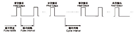 控制儀每次輸出一位的驅(qū)動(dòng)電壓,一個(gè)驅(qū)動(dòng)電壓持續(xù)時(shí)間,稱(chēng)為脈沖寬度。相鄰二個(gè)輸出驅(qū)動(dòng)電壓之間的間隔時(shí)間,稱(chēng)為脈沖間隔。控制儀完成對(duì)所有位的電磁閥驅(qū)動(dòng)輸出所需要的時(shí)間,稱(chēng)為脈沖周期。兩個(gè)脈沖周期之間的停頓時(shí)間,稱(chēng)為循環(huán)間隔。