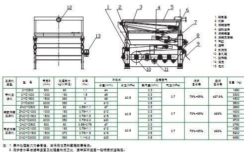 帶式濃縮壓濾機(jī)(DNDYQ型)是用于未經(jīng)濃縮池的污泥的處理(如A/O法、SBR法的剩余污泥),與ZNDYQ型的濃縮結(jié)構(gòu)不同,先期依靠濾帶重力脫水,適用更大的處理量。