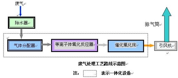 擬處理的異味氣體主要含有DMF(N,N-二甲基甲酰胺)和二甲胺,根據(jù)其特點,同時考慮運營成本及管理維護(hù)方便性,本方案工藝路線擬采用“低溫等離子體廢氣處理技術(shù)”工藝來處理該廢氣。對廠區(qū)內(nèi)三股廢氣分別進(jìn)行收集,然后集中在一起輸入凈化裝置,凈化后的氣體擬采用煙囪高空排放。
