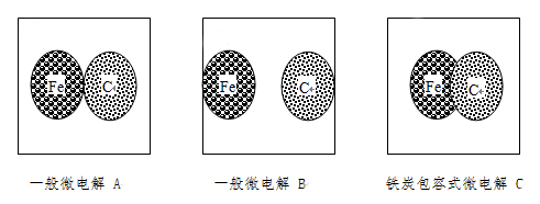 ● 鐵炭包容式微電解反應為:鐵原子與炭原子是相互包容組成架構(gòu)而形成的原電池反應。這種鐵炭接觸不存在鐵與炭的分層問題,因此更有利于電子的轉(zhuǎn)移,電荷效率較高,廢水中有機物的去除效率也較高。如圖C