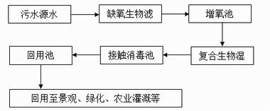 該項目治理目標(biāo)為現(xiàn)有村莊、自然村家庭飯店及待建賓館排放的廢水,廢水經(jīng)處理后,全部回用于農(nóng)業(yè)灌溉及綠化、景觀用水。本工程主要采用復(fù)合人工濕地凈化技術(shù)并輔助缺氧生物濾池技術(shù)對污水進行處理,工藝流程如下: