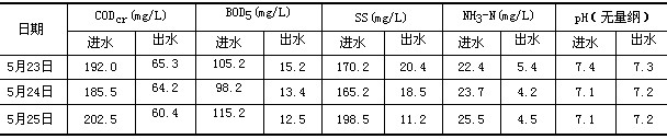 該工程運行初期,因預處理工段效果尚不明顯,為減少潛流式人工濕地的負荷,采用對預處理池出水進行回流,以加大預處理工序的進水,增加對池中填料及污泥的擾動,并3次投加化糞池污泥,以縮短預處理工序的生化培養(yǎng)時間、增強系統(tǒng)的抗沖擊能力。經(jīng)過25天的培養(yǎng)馴化調(diào)試,預處理池填料上附著生物膜,出水池中出水有成熟的生物膜脫落,系統(tǒng)進入穩(wěn)定運行階段,出水水質(zhì)達到設(shè)計要求,對COD、BOD5、SS、NH4+-N的平均去除率分別達到67.2%、87.0%、90.4%和80.2%。該工程于2010年4月通過環(huán)保局驗收,并一直穩(wěn)定運行至今,5月23日-5月25日的