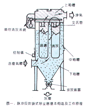 含塵氣體由除塵機(jī)進(jìn)風(fēng)口進(jìn)入除塵器中下箱體,因氣流體積突然擴(kuò)張,流速驟然降低,顆粒較大的粉塵由于碰撞和自重的作用從含塵氣流中分離出來沉降到下箱體灰斗內(nèi)。細(xì)小的塵粒經(jīng)篩濾,碰撞、攔截、擴(kuò)散等各種效應(yīng)作用,被滯阻在濾袋外表面,經(jīng)濾袋凈化后的氣體從文氏管進(jìn)入上箱體后,由出風(fēng)口排出。隨著工作時(shí)間的增加,積附在濾袋表面的粉塵越來越多,濾袋對(duì)氣流的阻力也隨之增大,致使通過濾袋的氣體量逐漸減少,為使濾袋阻力控制在除塵器能正常工作的一個(gè)限定范圍內(nèi),就必須對(duì)濾袋上積附的粉塵進(jìn)行周期性清除。清灰是由脈沖控制儀按預(yù)定的順序觸發(fā)各電磁閥開啟,氣包內(nèi)壓縮空氣瞬時(shí)地經(jīng)氣閥由噴吹管的各孔噴出,再經(jīng)文氏管噴入到各對(duì)應(yīng)的濾袋內(nèi)。濾袋在瞬時(shí)逆向高壓氣流作用下急劇膨脹,隨年收縮,將積附在其表面的粉塵抖落,從而阻力得到減小來完成的。通過對(duì)濾袋表面積附的粉塵周期性的清灰,使阻力保持相對(duì)穩(wěn)定,是除塵系統(tǒng)正常工作的重要環(huán)節(jié)。由于沉降作用及清灰掉落的粉塵積聚于灰斗內(nèi),通過排塵裝置排出。
