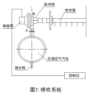噴吹系統(tǒng)的組成(圖2)。脈沖閥A端接壓縮空氣氣包,B端接噴吹管,控制閥動(dòng)作由控制儀發(fā)出指令。在控制儀無(wú)信號(hào)輸出時(shí),控制閥的活動(dòng)鐵芯封住排氣口,脈沖閥處于關(guān)閉狀態(tài)。當(dāng)控制儀發(fā)出信號(hào)時(shí),控制閥將脈沖背壓室與大氣相通,脈沖閥開(kāi)啟,壓縮空氣由氣包通過(guò)脈沖閥經(jīng)噴吹管小孔噴進(jìn)文氏管,改成濾袋內(nèi)瞬時(shí)正壓,實(shí)現(xiàn)清灰。
