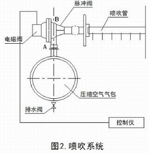 噴吹系統(tǒng)的組成(圖2)。脈沖閥A端接壓縮空氣氣包,B端接噴吹管,控制閥動作由控制儀發(fā)出指令。在控制儀無信號輸出時(shí),控制閥的活動鐵芯封住排氣口,脈沖閥處于關(guān)閉狀態(tài)。當(dāng)控制儀發(fā)出信號時(shí),控制閥將脈沖背壓室與大氣相通,脈沖閥開啟,壓縮空氣由氣包通過脈沖閥經(jīng)噴吹管小孔噴進(jìn)文氏管,改成濾袋內(nèi)瞬時(shí)正壓,實(shí)現(xiàn)清灰。