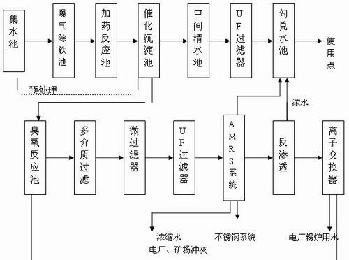 濁環(huán)水經(jīng)曝氣、混凝反應(yīng)、催化沉淀后,部分經(jīng)UF過濾器后送到勾兌水池,部分經(jīng)殺菌消毒、多介質(zhì)過濾微濾、UF過濾后由壓力泵送入AMRS裝置,達(dá)到自來水標(biāo)準(zhǔn),再將其中部分進(jìn)入勾兌水池作為凈環(huán)水使用,350 m3作為除鹽水供不銹冷軋系統(tǒng)使用,350 m3經(jīng)反滲透和混床處理后供發(fā)電廠中溫中壓鍋爐使用。工藝流程圖見圖1。整個(gè)工程分兩大部分:預(yù)處理部分和除鹽站部分。
