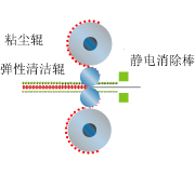 特殊制作的彈性清潔輥與卷材充分接觸,彈性清潔輥能夠?qū)⑸钊刖聿慕缑鎸拥幕覊m拉出,并且清潔所有微米級的灰塵。所有被清潔處的灰塵轉(zhuǎn)移到預(yù)置的粘性輥上。