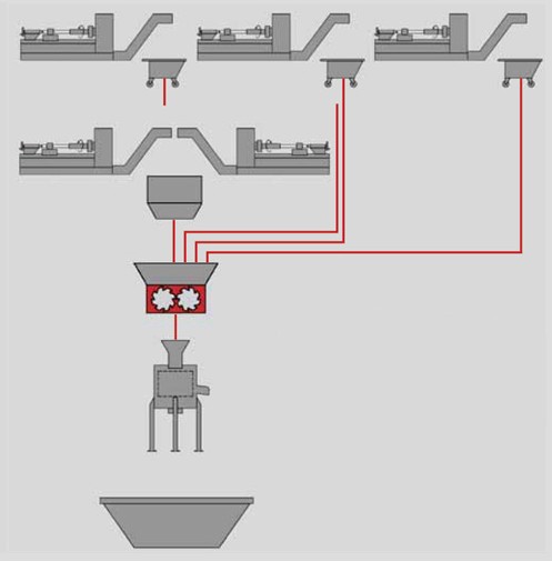 根據(jù)我們的經(jīng)驗(yàn),廢棄物分散處理是最佳的最干凈的處理方式,每個(gè)生產(chǎn)工序中的機(jī)器都配一臺撕碎單元機(jī),廢棄物撕碎之后再運(yùn)送到回收利用中心。