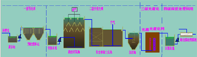 高濃度有機(jī)廢水處理系統(tǒng)的技術(shù)路線(參見上圖):a、廢水經(jīng)收集管路匯入調(diào)節(jié)池,廢水在該池中均質(zhì)并有控制地進(jìn)入處理系統(tǒng);b、將廢水輸入預(yù)處理單元,廢水在此單元內(nèi)一般作PH調(diào)整、懸浮物去除、大分子有機(jī)物及有毒有害污染物降解等處理,為后面的處理單元創(chuàng)造條件;c、廢水進(jìn)入高效厭氧反應(yīng)器,廢水中的有機(jī)物在此單元內(nèi)大部分得到降解,成為無害的氣體(如甲烷、氮?dú)獾龋┖蜔o機(jī)物,對大分子有機(jī)物如苯類物質(zhì)在此過程中被降解為小分子有機(jī)物或被徹底降解,經(jīng)厭氧反應(yīng)后的廢水有機(jī)物濃度大幅度降低,同時提高了后續(xù)好氧處理的可降解性;d、此單元為組合生物降解過程,按照廢水中污染物的性質(zhì)和處理要求,采用兼氧、好氧等工藝的組合實(shí)現(xiàn)廢水處理的達(dá)標(biāo),從生物特性分類一般分為生物膜法和活性污泥法兩類,按工藝又可分為AB、A/A/O、SBR等;e、廢水經(jīng)上述處理過程一般已達(dá)到排放標(biāo)準(zhǔn),為了達(dá)到深度凈化工業(yè)廢水和前級可能出現(xiàn)的生物分子,采用LED-光催化復(fù)合技術(shù)進(jìn)一步處理,并可延長后級處理中膜的使用壽命;f、為滿足處理后廢水的利用要求,在此設(shè)后續(xù)深度處理單元,本產(chǎn)品深度處理采用微過濾、超濾、鈉濾和反滲透等一種或幾種工藝的組合。廢水經(jīng)上述工藝流程處理后達(dá)標(biāo)排放或回用。