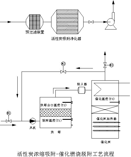 主要設(shè)備:催化燃燒脫附爐、活性碳濃縮吸附凈化裝置、吸附前處理器、吸附風(fēng)機(jī)等。