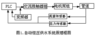 典型的自動(dòng)恒壓供水系統(tǒng)的結(jié)構(gòu)框圖如圖1所示;系統(tǒng)具有控制水泵出口總管壓力恒定、變流量供水功能,系統(tǒng)通過(guò)安裝在出水總管上的壓力傳感器、流量傳感器,實(shí)時(shí)將壓力、流量非電量信號(hào)轉(zhuǎn)換為電信號(hào),輸入至可編程控制器(PLC)的輸入模塊,信號(hào)經(jīng)CPU運(yùn)算處理后與設(shè)定的信號(hào)進(jìn)行比較運(yùn)算,得出最佳的運(yùn)行工況參數(shù),由系統(tǒng)的輸出模塊輸出邏輯控制指令和變頻器的頻率設(shè)定值,控制泵站投運(yùn)水泵的臺(tái)數(shù)及變量泵的運(yùn)行工況,并實(shí)現(xiàn)對(duì)每臺(tái)水泵根據(jù)CPU指令實(shí)施軟啟動(dòng)、軟切換及變頻運(yùn)行。系統(tǒng)可根據(jù)用戶(hù)用水量的變化,自動(dòng)確定泵組的水泵的循環(huán)運(yùn)行,以提高系統(tǒng)的穩(wěn)定性及供水的質(zhì)量。
