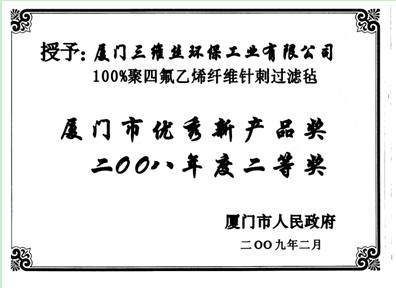 “100%聚四氟乙烯纖維針刺過(guò)濾氈”獲2008年廈門(mén)市優(yōu)秀新產(chǎn)品二等獎(jiǎng)