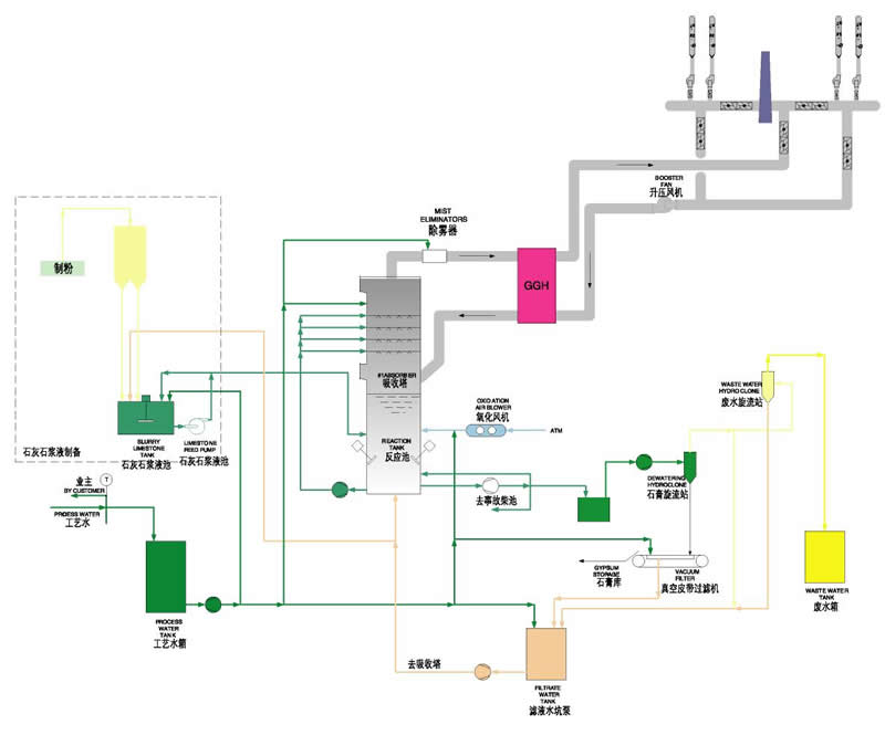 石灰石(石灰)—石膏濕法脫硫工藝(WFGD—WetFlueGasDesulfurization)采用價廉易得的石灰石或石灰作脫硫吸收劑,石灰石經(jīng)破碎磨細成粉狀與水混合攪拌成吸收漿液。當(dāng)采用石灰為吸收劑時,石灰粉經(jīng)消化處理后加水制成吸收漿。在吸收塔內(nèi),吸收漿液與煙氣接觸混合,煙氣中的二氧化硫與漿液中的碳酸鈣以及鼓入的氧化空氣進行化學(xué)反應(yīng)被脫除,最終反應(yīng)產(chǎn)物為石膏。脫硫后的煙氣經(jīng)除霧器除去帶出的細小液滴,經(jīng)換熱器加熱升溫后排入煙囪。脫硫石膏漿經(jīng)脫水裝置脫水后回收。
