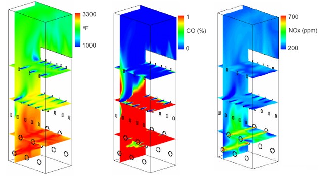 現(xiàn)代力學(xué)及計(jì)算機(jī)技術(shù)的發(fā)展使得復(fù)雜的流動、換熱、化學(xué)反應(yīng)的數(shù)值預(yù)測成為可能,如今采用計(jì)算流體動力學(xué)軟件和化學(xué)反應(yīng)動力學(xué)軟件CHEMKIN的耦合可以實(shí)現(xiàn)內(nèi)鍋爐內(nèi)的NOx生成進(jìn)行比較精確的模擬,這對SNCR工藝溫度窗口的選擇和控制顯得尤為重要。圖3給出了鍋爐內(nèi)的溫度、CO和NOx的CFD模擬結(jié)果。