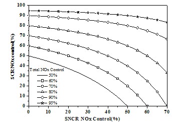SNCR/SCR聯(lián)合煙氣脫硝技術(shù)結(jié)合了兩者優(yōu)勢,將SNCR工藝的還原劑噴入爐膛,用SCR工藝使逸出的NH3和未脫除的NOx進(jìn)行催化還原反應(yīng)。典型的聯(lián)合裝置能脫除84%的NOx,同時逸出NH3濃度低于10ppm。圖2給出了SNCR/SCR聯(lián)合工藝NOx的理論脫除效率曲線,橫坐標(biāo)和縱坐標(biāo)分別表示單純采用SNCR或SCR工藝時NOx的脫除效率,從圖中可以看出,如果要達(dá)到50%的總脫除效率,并假如SNCR的效率為20%,那么SCR的效率只要不低于37.5%就能滿足要求。應(yīng)當(dāng)指出的是,圖2并未考慮低氮燃燒器或燃燒改進(jìn)引起的氮氧化物脫除,假如該效率以50%計(jì),SNCR和SCR的效率分別為20%和37.5%,那么總的NOx效率將高達(dá)75%。該分析方法也同樣適合于其它聯(lián)合工藝效率的估計(jì),然而應(yīng)當(dāng)注意的是總的投資成本和運(yùn)行費(fèi)用并不一定由于聯(lián)合工藝的采用而降低,煙氣脫硝工藝的選擇應(yīng)根據(jù)具體的鍋爐型式和負(fù)荷、煙氣條件和NOx濃度、需要達(dá)到的效率、還原劑供給條件、場地條件、預(yù)熱器和電除塵器情況、FGD裝置特點(diǎn)等因素綜合考慮,以達(dá)到最佳的技術(shù)經(jīng)濟(jì)性能。