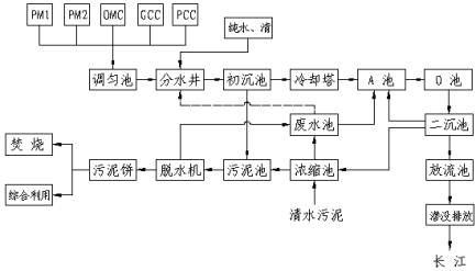 廢水處理過程:從PM1、PM2、OMC、GCC、PCC出來的車間廢水首先進(jìn)入調(diào)勻池,對各個(gè)車間的廢水進(jìn)行充分的混合,而且還可以起到調(diào)節(jié)作用,防止廢水沖擊負(fù)荷;進(jìn)入分水井后,對濃度高的廢水使用純水或清水進(jìn)行調(diào)質(zhì)處理,降低廢水濃度,避免高濃度的廢水對生物處理系統(tǒng)造成危害;廢水進(jìn)入初沉池首先可以去除廢水中容易沉降的大顆粒污染物;由于車間的廢水溫度較高對生化不利,所以經(jīng)過冷卻水塔可以將廢水的溫度降到合適生化的溫度;經(jīng)過沉淀處理后的廢水和回流污泥同時(shí)流入A池進(jìn)行厭氧反應(yīng),待停留一段時(shí)間后再流入O池內(nèi)氧化,由于微生物在厭氧和好氧的狀態(tài)下交替操作,可以篩選及馴化脫磷菌種,發(fā)揮脫磷功能。同時(shí)微生物可利用BOD當(dāng)作有機(jī)源,也可以發(fā)揮一部分脫氮功能;經(jīng)過處理的廢水進(jìn)入二沉池,沉淀后上清液體進(jìn)入放流池,采用潛沒排放,處理達(dá)標(biāo)的水直接放入長江;污泥經(jīng)過濃縮、脫水,然后進(jìn)行焚燒和綜合利用。