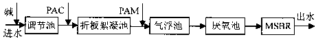 采用物化-生化組合處理工藝。物化部分采用混凝氣浮,生化部分采用厭氧和組合式MSBR反應(yīng)池。其工藝流程見圖1。