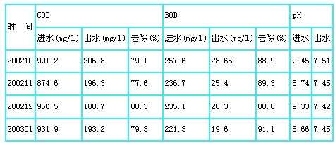 表1中列出了污水處理廠試運(yùn)行4個(gè)月以來每月平均日污水處理情況,從中可以看出該處理系統(tǒng)有較強(qiáng)的COD、BOD去除能力。進(jìn)水COD為874.6~991.2 mg/L,BOD為221.3~257.6 mg /L時(shí),出水COD基本穩(wěn)定在200 mg/L,平均去除率為79%左右,BOD小于30 mg/L,平均去除率為89%左右。而進(jìn)水pH普遍比較高,這與設(shè)計(jì)要求有很大的出入,在試運(yùn)行期間幾乎就沒有開啟過加堿裝置,造成了設(shè)備的極大浪費(fèi)。