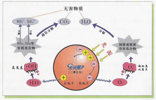 二氧化鈦見光會產(chǎn)生正 、負(fù)電子與空氣當(dāng)中的水分子結(jié)合產(chǎn)生氫氧自由基,實(shí)踐證明,氫氧自由基具有強(qiáng)大的氧化分解能力,它能分解幾乎所有的有機(jī)化合物和一部分的無機(jī)物,將它們分解成無害的二氧化碳和其他物質(zhì),而負(fù)電子與空氣當(dāng)中的氧結(jié)合會產(chǎn)生活性氧,也就是超級氧化離子,超級氧化離子也具有很強(qiáng)的氧化分解能力,它可以破壞細(xì)菌 、霉菌,這些有機(jī)物的細(xì)胞膜,固化病毒的蛋白質(zhì),在殺菌的同時(shí)還能分解細(xì)菌尸體上釋放出的有害復(fù)合物 。