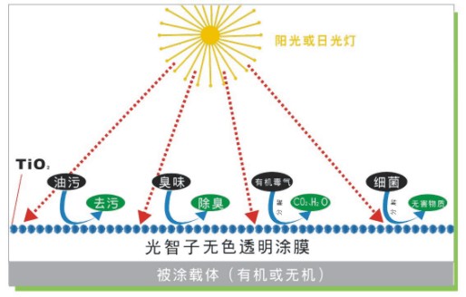 二氧化鈦(Ti O2)本身為食品添加劑,對人體無毒無害,以二氧化鈦為主要成分的光智子(光觸媒),具有強(qiáng)大的氧化分解能力,即使在室內(nèi)日光等微弱光源下也能發(fā)揮其功能 。