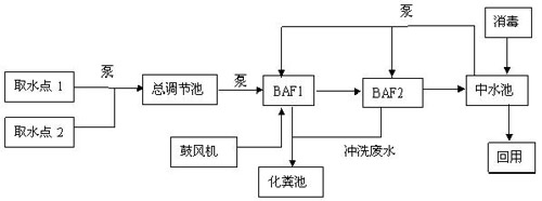 根據(jù)回用水質(zhì)要求的不同組合成不同的工藝流程,其中的一種較簡單的工藝流程如下: