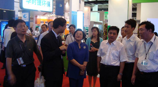 | 圖1. 全國政協(xié)副主席林文漪(左三)、環(huán)境保護部副部長吳曉青(左四)、廣東省環(huán)保產業(yè)協(xié)會秘書長解賀林(右一)參觀宇星展位 |