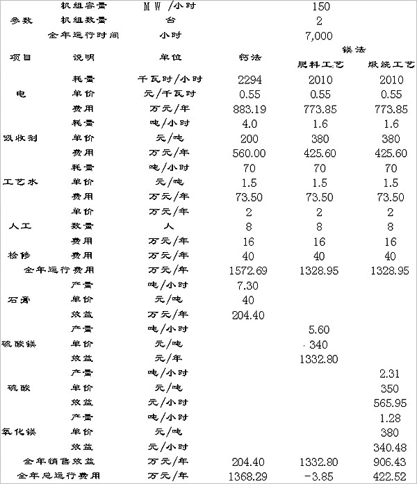 表一:鎂基脫硫與鈣基脫硫技術(shù)經(jīng)濟性對比表