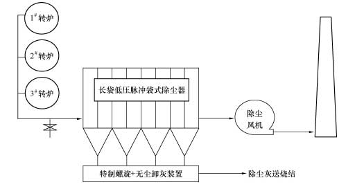 每座轉(zhuǎn)爐的含塵煙氣分別由二次煙塵爐前罩兩側(cè)的支管抽出,同時爐后設(shè)吸塵罩,爐前、爐后捕集的含塵煙氣在爐后匯合后進入干管,三座轉(zhuǎn)爐的煙氣在爐后最后匯合進入總管,接至長袋低壓脈沖袋式除塵器,凈化后的氣體經(jīng)風機由煙囪排至大氣,除塵器收集下的含鐵粉塵由汽車定期送到燒結(jié)廠再利用。