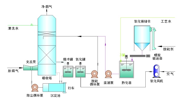 氧化鎂法用氧化鎂熟化后生成的乳液作為吸收劑吸收SO2,針對(duì)脫硫產(chǎn)物的處理方法不同又可分為回收法和拋棄法。拋棄法工藝流程簡(jiǎn)單,操作環(huán)境清潔,應(yīng)用較多;回收法工藝流程復(fù)雜,能耗高,回收成本高,但能實(shí)現(xiàn)資源化利用。