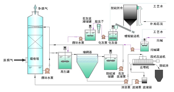 雙堿法是利用可溶性的堿性鹽在塔內(nèi)與SO2反應(yīng)生成可溶性的酸式鹽,在塔外添加鈣基脫硫劑進(jìn)行再生,并經(jīng)過絮凝、沉淀、除渣等操作后將堿性清液返回吸收塔重新吸收SO2;脫硫渣或拋棄或經(jīng)氧化生成二水石膏回收。