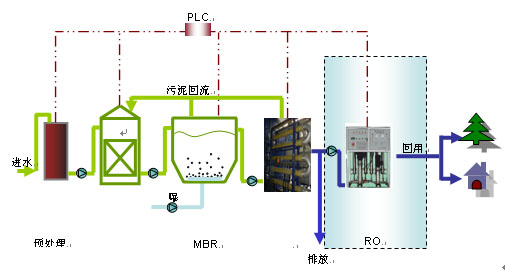 TMBR技術是用膜過濾替代傳統(tǒng)活性污泥法的二沉池,通過超濾(UF)進行固液分離,將粒徑大于0.02 m的顆粒、懸浮物等截留在系統(tǒng)內(nèi),可使生化池內(nèi)的污泥濃度從3~5 g/L提高到20~30g/L,甚至可達到40g/L或更高,并且無須太多考慮污泥沉降和膨化的問題。出水無菌體及懸浮物。由于反應器內(nèi)保持較高的活性污泥濃度,難降解的物質(zhì)在反應器中也不斷反應、降解,而水力停留時間(HRT)卻能大大縮短。工程占地面積。皇S辔勰嗔啃;運行費用較低。根據(jù)不同情況,TMBR出水后續(xù)可用NF或RO作深度處理。TMBR工藝通過膜分離技術大大強化了生物反應器的功能。垃圾滲濾液經(jīng)TMBR處理后,一般能滿足間接排放要求。